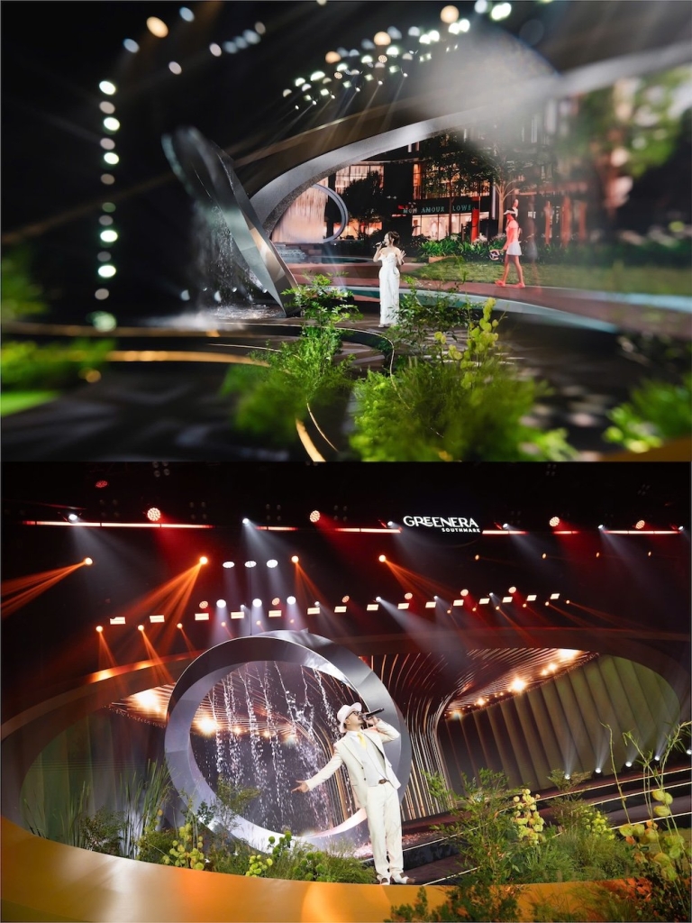 Bước vào khán phòng, khách mời sẽ ngay lập tức ấn tượng trước hình ảnh tấm gương nước đầu nguồn suối Harmonia – biểu tượng cảnh quan đặc trưng nằm dưới chân Greenera Southmark, nay được tái hiện sống động ngay trên sân khấu. Âm thanh róc rách của nước, hòa cùng nền nhạc êm dịu mang sắc thái chữa lành thường thấy ở những khu nghỉ dưỡng cao cấp, gợi mở một không gian an lành và thư thái – như thể đưa cả hơi thở của dự án đến với khoảnh khắc trải nghiệm hôm nay.